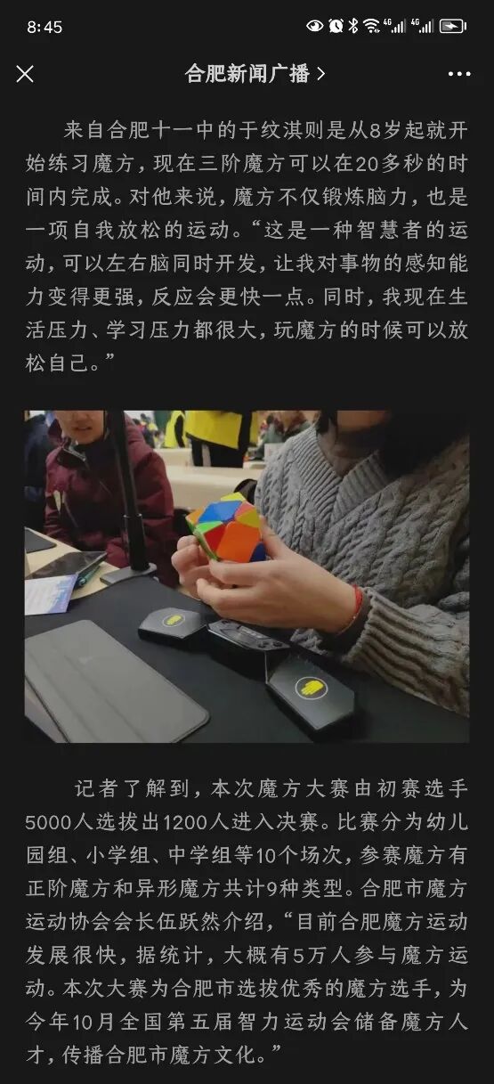 该项赛事由合肥市体育局、合肥市教育局主办,合肥市魔方运动协会协办,5000多人参加预赛,1200人参加复赛。合肥六中教育集团瑶海分校选手在刘涛、张海航老师组织带领下参加了预赛,共9人成功晋级复赛。